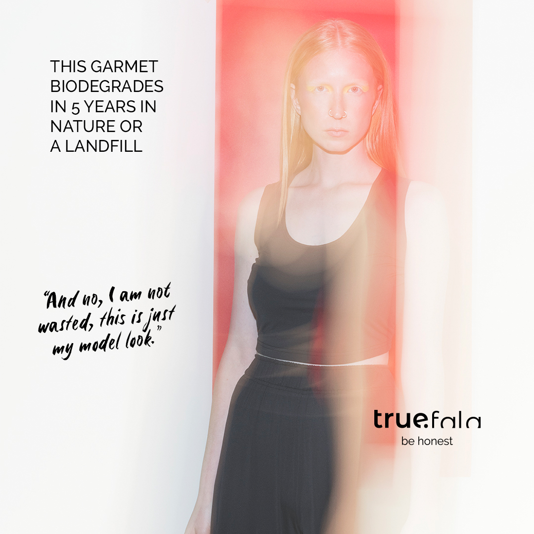 The brand is sustainable - Truefala uses biodegradable fabrics and components sustainably produced in European Union. The fabric and components biodegrade in landfill or soil to biomass without releasing any harmful ingredients.